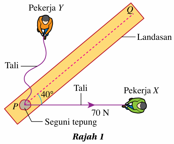 Rajah 1 menunjukkan pandangan dari atas bagi seorang pekerja X yang mengenakan daya tarikan 70 N ke atas seguni tepung di atas suatu landasan.