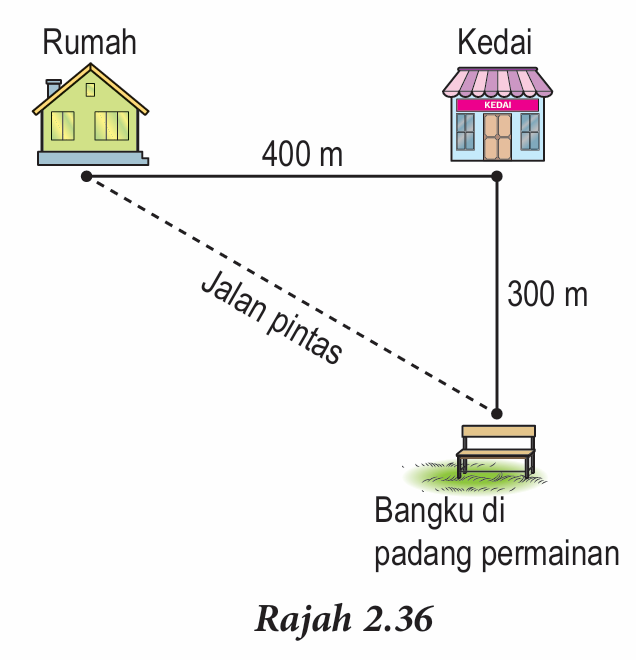 Rajah 2.36 menunjukkan Rokiah mengambil masa 3 minit untuk berjalan ke kedai runcit yang berada 400 m di sebelah kanan rumahnya. Selepas 1 minit, dia membeli aiskrim dan berjalan ke padang permainan yang terletak 300 m dari kedai runcit dalam masa 2 minit. Dia duduk dan berehat di bangku berhampiran padang permainan selama 2 minit. Kemudian, menggunakan jalan pintas kembali ke rumahnya. Rokiah tiba di rumahnya dalam masa 2 minit.