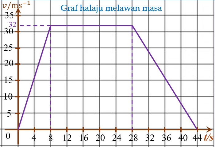 Sebuah kereta dipandu dari keadaan pegun sehingga mencapai pecutan 4 m s–2 dalam masa 8 saat di lebuh raya yang lurus. Kereta itu kemudiannya dipandu pada halaju seragam selama 20 saat sebelum breknya ditekan. Kereta mengalami pengurangan halaju pada kadar 2 m s–2 sehingga berhenti. Lakarkan graf