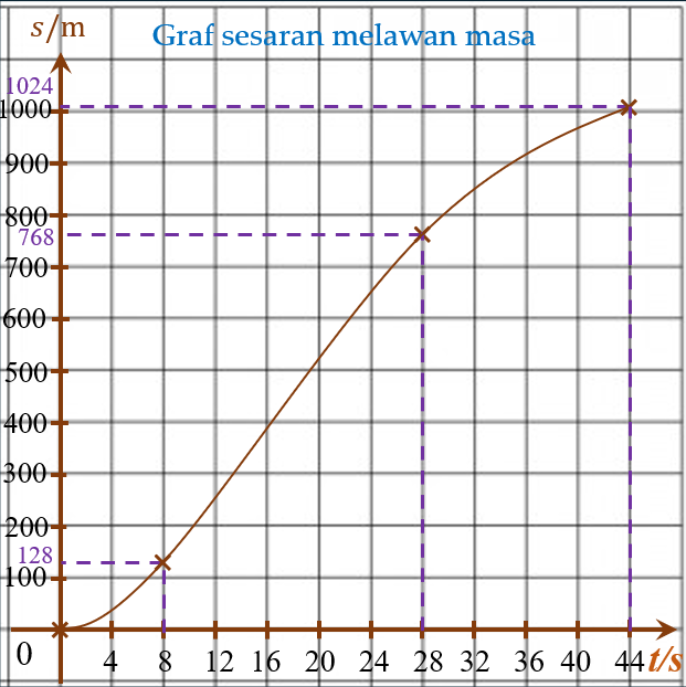 $$ \begin{aligned} &\text { Bahagian } 3 \text { (pengurangan halaju) }\\ &\begin{aligned} u & =32 \mathrm{~ms}^{-1} \\ v & =0 \mathrm{~ms}^{-1} \\ t & =16 s[\text { dari (b), 44-28] } \\ s & =? \end{aligned} \end{aligned} $$