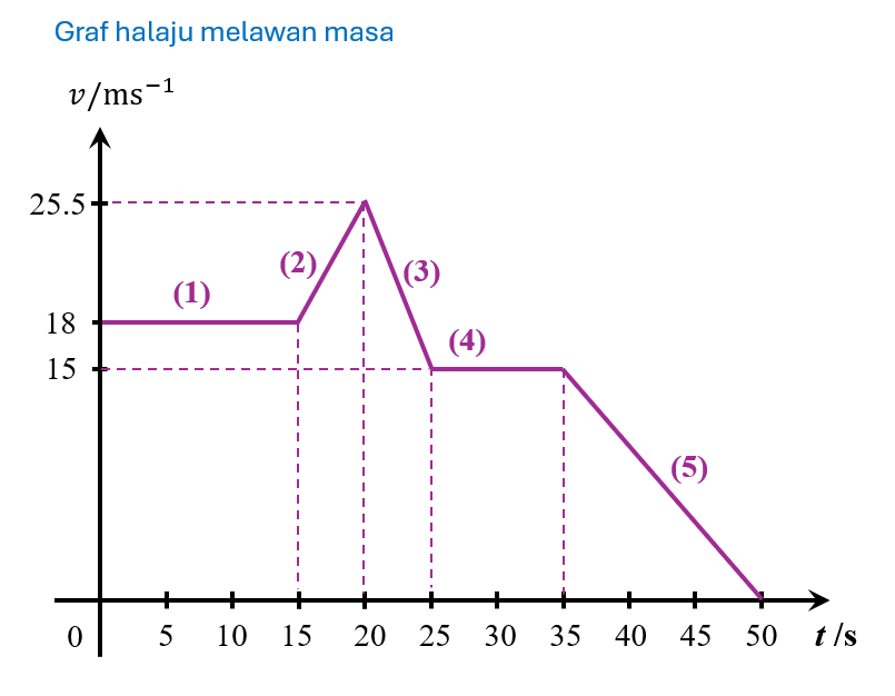 $$ \text { (1) Halaju seragam } 18 \mathrm{~m} \mathrm{~s}^{-1} \text { selama } 15 \mathrm{~s} $$