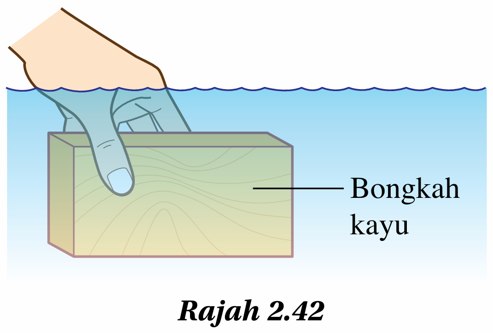 Rajah 2.42 menunjukkan satu bongkah berjisim 0.48 kg dengan isi padu 5.0 × 10–4 m3 dipegang di dalam air. Tentukan gerakan bongkah itu apabila dilepaskan.
