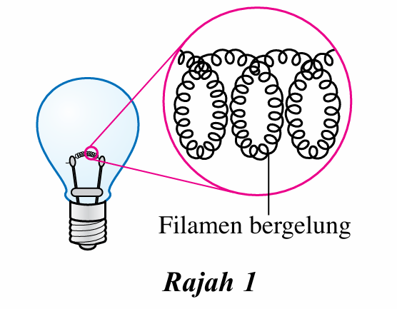Rajah 1 menunjukkan sebuah lampu filamen. Mengapakah filamen dalam bentuk yang bergelung menghasilkan cahaya yang lebih terang?