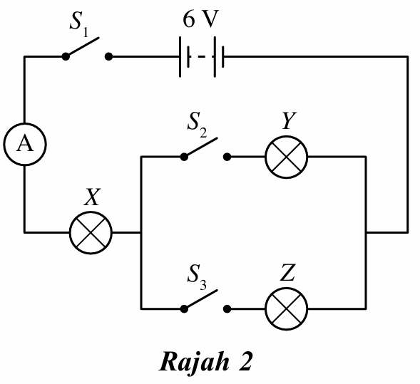 Rajah 2 menunjukkan litar dengan tiga mentol, iaitu X, Y dan Z yang mempunyai rintangan 3 Ω masing-masing.