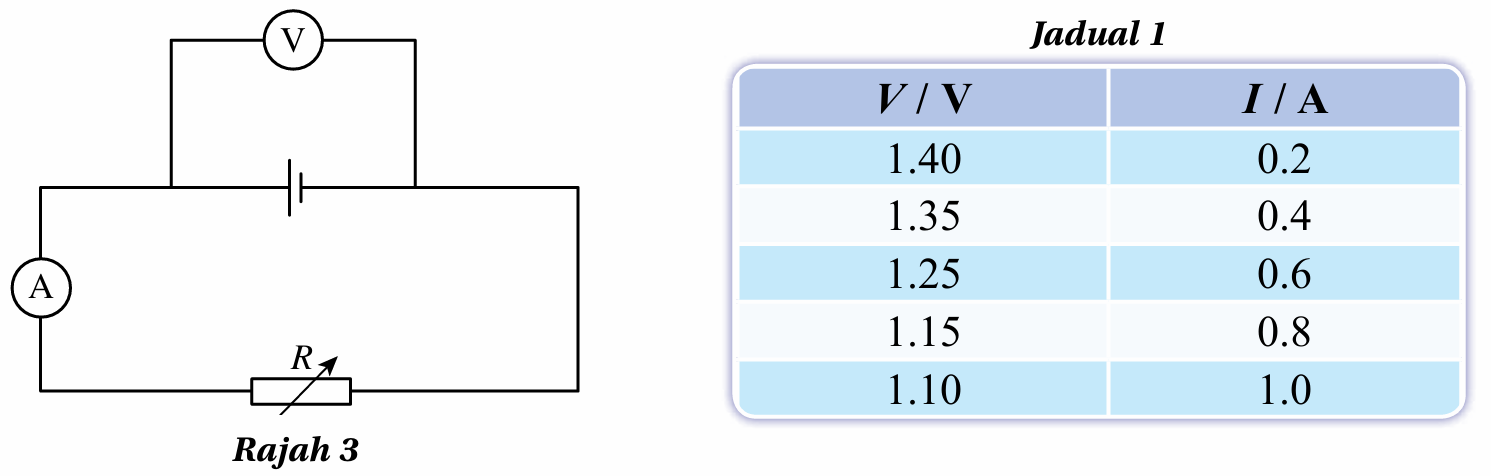 Satu eksperimen telah dijalankan untuk mengkaji hubungan antara daya gerak elektrik, Ԑ dengan rintangan dalam, r sebuah sel kering. Sambungan litar elektrik eksperimen tersebut adalah seperti yang ditunjukkan dalam Rajah 3. Bacaan voltmeter, V dan bacaan ammeter, I yang sepadan adalah seperti yang ditunjukkan dalam Jadual 1.