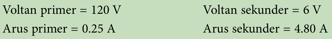 $$ \begin{aligned} &\text { Kecekapan, } \eta =\frac{\text { Kuasa output }}{\text { Kuasa input }} \times 100 \% \\ & =\frac{V_{\mathrm{S}} I_{\mathrm{S}}}{V_{\mathrm{P}} I_{\mathrm{P}}} \times 100 \% \\ & =\frac{6 \times 4.80}{120 \times 0.25} \times 100 \% \\ & =96.00 \% \end{aligned} $$